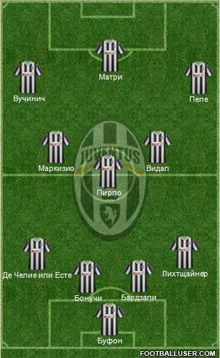 Основен проблем за Антонио Конте е наказанието на Киелини за един мач , поради натрупани картони  и травмата на Куалярела , които се очаква да започне тренировки в понеделник . Джакерини е с мускулен проблем според информациите и също не попадна в групата за мача . Според анализаторите  няма съмнение , че на вратата ще е Джиджи Буфон . Пред него като двама централни защитници - Бардзали и Бонучи , в дясната зона Лихтщайнер и единствения все още неясен пост според медиите е в ляво . Както и самия Антонио Конте каза , на Де Челие не му е гарантирано титулярното място в този мач . Конте , ще реши в последния момент дали да заложи на Де Челие или да експерементира с Естегарибиа в тази зона . В халфовата линия всичко е ясно - Маркизио , Пирло и Видал . Нападанието в предвид травмата на Куалярела , ще се води от Матри , подпомаган от Вучинич и Пепе . Резервите в тази среща , ще са - Сторари , Сьоренсен , Мароне , Елиа , Есте или Де Челие , Красич , Дел Пиеро , Бориело .