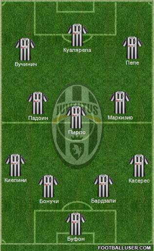 Според друга медия , пред Джиджи Буфон се очаква да са Бардзали , Бонучи и Киелини , като анализаторите смятат , че Конте ще заложи на схема 3 - 5 - 2 . В халфовата линия Пирло , Джакерини или Падоин и Маркизио , като по крилата се очаква да са Касерес в дясно и Пепе или Де Челие в ляво . В атаката се очаква да бъде заложено на Вучинич и Куалярела или Матри . Видал е наказан , а Дел Пиеро е болен .